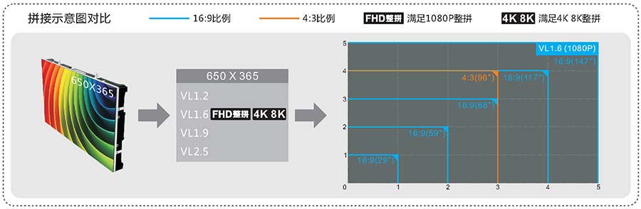 单元箱体尺寸为650mm×365mm,采用16:9宽高比设计,能快速高效的拼成4:3或16:9的高清大屏。